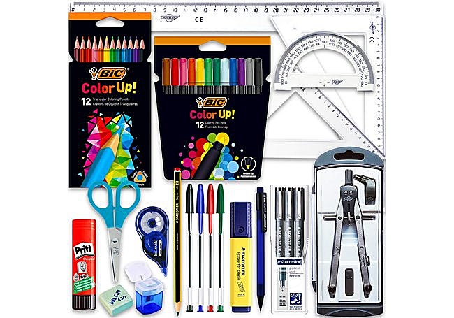 Con un enfoque práctico, este set de material escolar Coleset reúne en un solo paquete todo lo necesario para estudiantes de secundaria. Incluye bolígrafos Bic de cuatro colores, lápices, rotuladores, tijeras y un compás con adaptador, además de una selección completa de reglas y accesorios básicos para el día a día en clase.