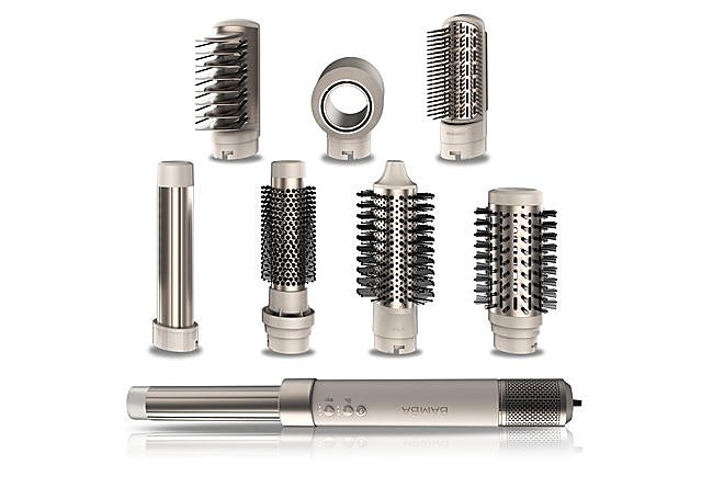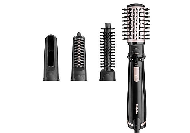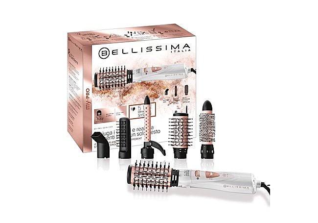 El cepillo moldeador de aire BELLISSIMA cuenta con cinco accesorios intercambiables y revestimiento cerámico que protege el cabello y distribuye el calor uniformemente. Tiene dos ajustes de flujo de aire y temperatura, y función de aire frío para fijar el peinado.