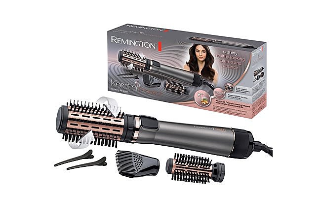 El cepillo de aire giratorio de Remington es una herramienta para peinar el cabello en casa. Su revestimiento de cerámica avanzada, enriquecido con queratina y aceite de almendra, protege y nutre. Incluye tres accesorios versátiles para alisar, dar volumen o secar. Con 1000 W de potencia, facilita el secado.