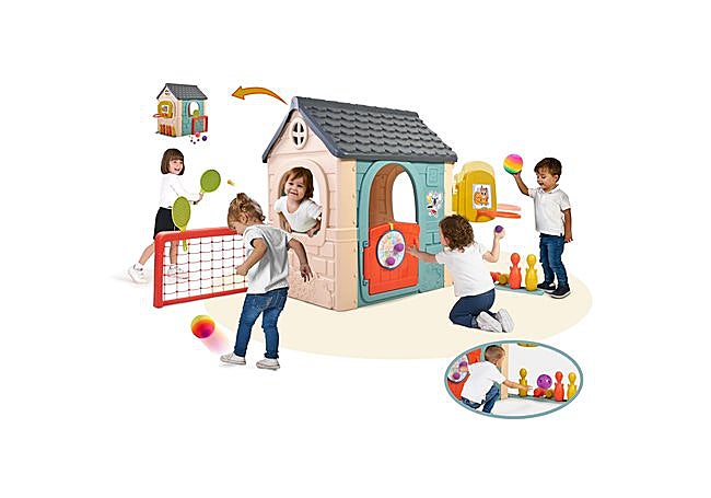Con seis juegos integrados y accesorios incluidos, la casa de actividades FEBER transforma cualquier jardín en un espacio dinámico. Su estructura de plástico resistente y colores que no pierden intensidad con el sol garantizan que los niños disfruten durante mucho tiempo sin preocupaciones por el desgaste.