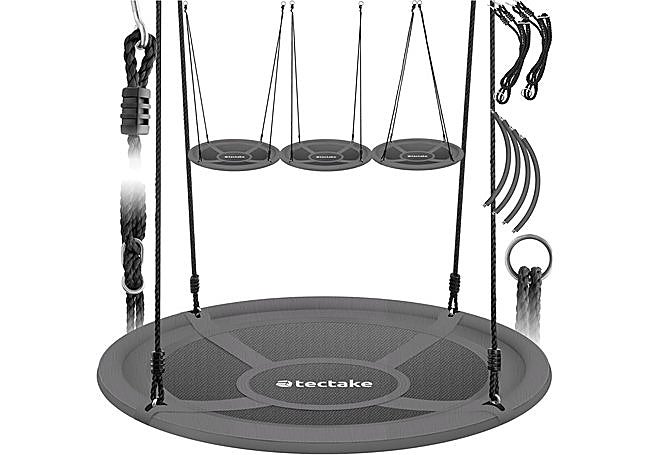 Gracias a su formato redondo y estructura robusta, este columpio de TecTake ofrece un espacio amplio para disfrutar al aire libre. Fabricado con materiales resistentes a la intemperie y equipado con cuerdas gruesas, soporta hasta 300 kg, lo que permite que tanto niños como adultos compartan momentos de juego en el jardín o terraza.