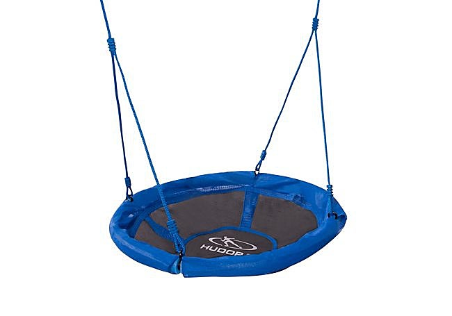 El modelo Hudora Nido de Columpio 90 destaca por su asiento redondo de 90 cm, fabricado en materiales plásticos robustos y con sistema de suspensión de acero inoxidable.