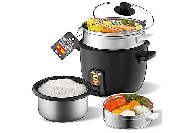La olla arrocera Mihoho de 2 litros tiene un recipiente antiadherente extraíble y una bandeja de vapor. Además, cuenta con función automática de mantener caliente, materiales libres de BPA y una tapa de vidrio para controlar el proceso de cocción de manera efectiva.
