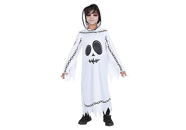 Con detalles impresos digitalmente, este disfraz infantil de fantasma de Rubies incluye una túnica blanca con capucha y motivos de cadenas. Está fabricado en poliéster suave y cuenta con cierre pull on. Es un diseño oficial para Halloween y fiestas temáticas.