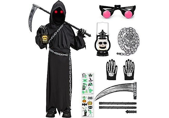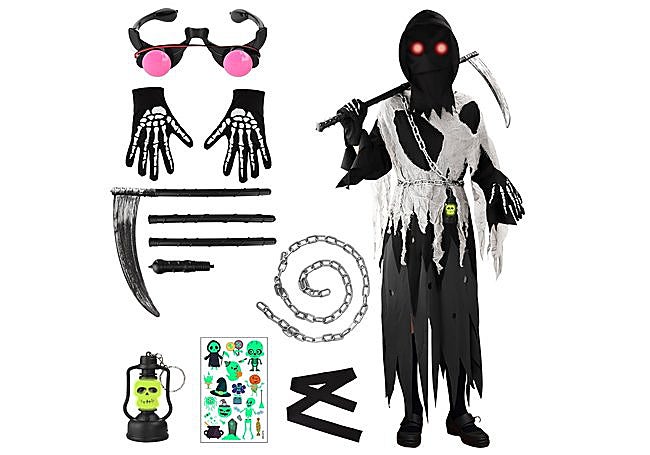 Conjunto completo de disfraz infantil de Halloween que incluye bata negra, guantes, linterna de cráneo, cadena, gafas luminosas y guadaña. El poliéster de alta calidad aporta suavidad y transpirabilidad. Las gafas con ojos rojos brillantes añaden un toque impactante, mientras que los accesorios luminosos aumentan la visibilidad y realzan el efecto visual durante la celebración.