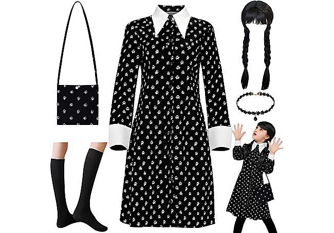 El disfraz gótico de princesa NLMWTI para niña está confeccionado en tejido suave e incluye vestido, peluca, medias, collar y bolso a juego. El diseño presenta detalles cuidados y costuras resistentes. Los materiales son transpirables y adecuados para celebraciones temáticas.