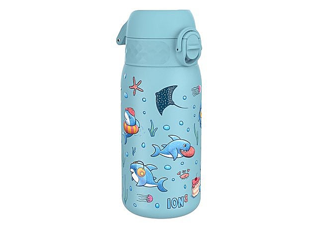 Con un diseño temático de tiburones y estructura ligera, esta botella de agua ion8 de 400 ml destaca por su formato ergonómico y resistente. El acero inoxidable de grado alimentario asegura durabilidad y evita olores, mientras la tapa abatible facilita el acceso, incluso para los más pequeños.