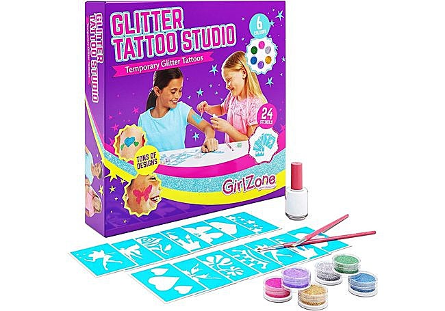 Más que un simple set de tatuajes, GirlZone ofrece una experiencia creativa para niñas de 3 a 12 años. El kit incluye 33 piezas con plantillas reutilizables, seis colores de purpurina y pinceles, permitiendo que cada diseño sea único y brillante. La aplicación es sencilla y segura, gracias al adhesivo corporal no tóxico.