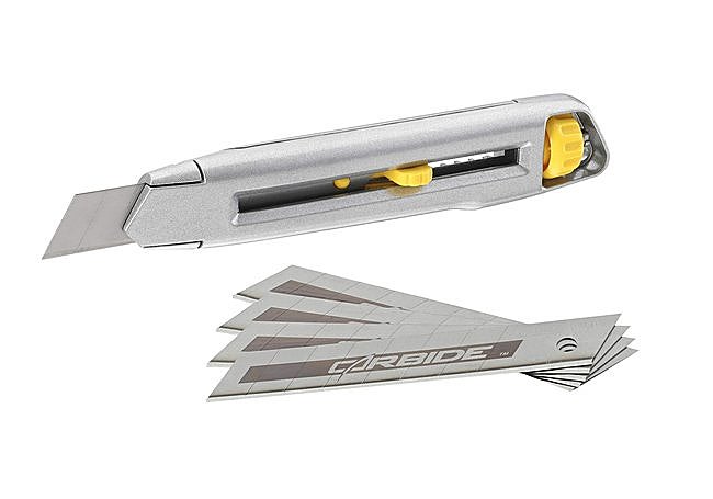 Con un diseño robusto en gris y amarillo, el cuchillo de precisión STANLEY 7-10-018 destaca por su sistema de interbloqueo que aporta seguridad adicional en cada corte. El mango ergonómico facilita el agarre, incluso durante tareas prolongadas, y las hojas de carburo garantizan un filo duradero para cortes precisos en materiales variados.