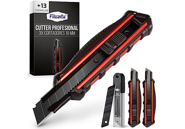 Con una estructura de aluminio resistente y empuñadura ergonómica, el set Filzada 3x Cutter Profesional ofrece precisión y seguridad en cada corte. El cuerpo robusto soporta el uso intensivo, mientras que el diseño antideslizante permite un manejo cómodo incluso en tareas largas. Incluye trece cuchillas de acero al carbono, protegidas en una caja que evita el óxido.