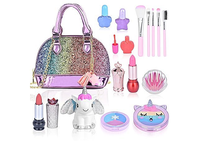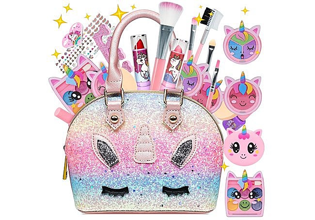 Este set con diseño de unicornio incluye 22 piezas lavables y no tóxicas en una bolsa versátil. Contiene coloretes, sombras, labiales y accesorios para uñas, con materiales pensados para facilitar la limpieza. El formato compacto facilita el transporte.