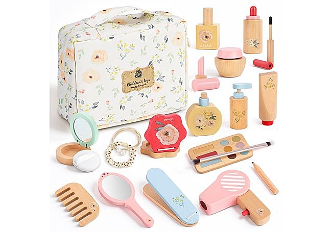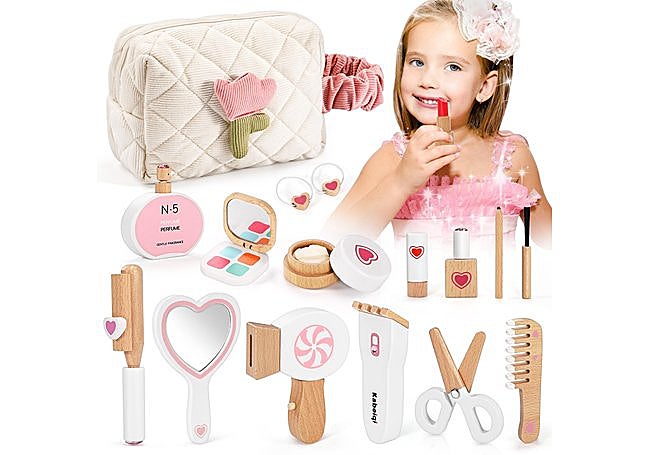 Fabricado en madera resistente, este set Tuseasy incluye 16 piezas con accesorios de peluquería y tocador y bordes redondeados. Los acabados están pensados para un uso seguro y la bolsa de almacenaje facilita la organización. El formato ofrece una opción duradera y de aspecto realista.