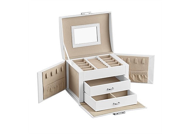 Con tres niveles bien compartimentados, la caja joyero SONGMICS en blanco clásico combina estructura robusta y forro de terciopelo para proteger cada joya. Incluye dos cajones, cerradura con llaves, asa superior y espejo interior, facilitando la organización y el acceso rápido. El exterior en PU y las costuras cuidadas aportan un acabado elegante y duradero.