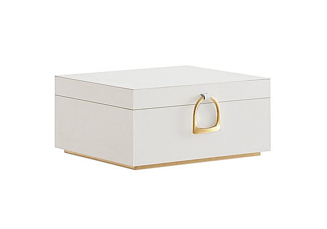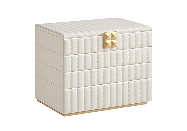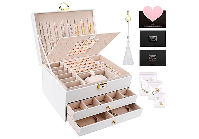 La caja joyero TAVADA de tres niveles en blanco y dorado incluye dos cajones extraíbles y compartimentos diferenciados para organizar las piezas. El exterior está fabricado en cuero PU y el interior forrado en terciopelo suave para proteger las joyas. Incluye paños para pulir.