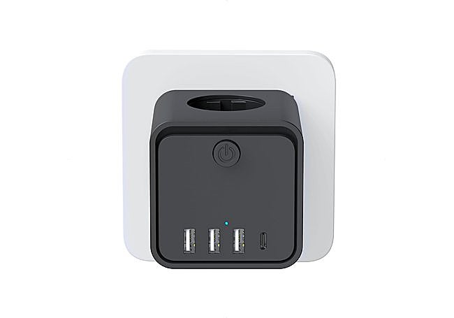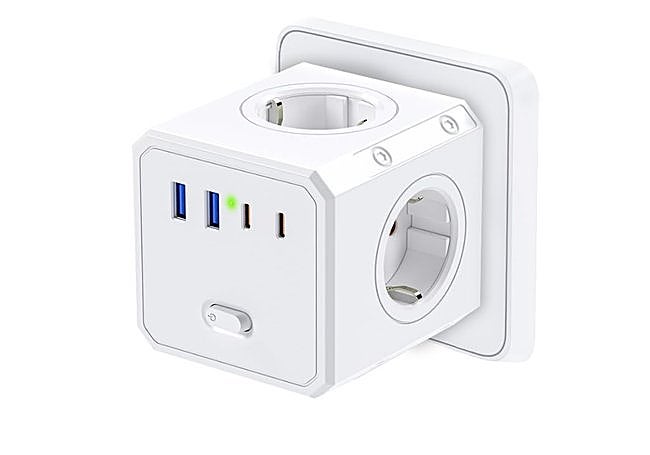 Con estructura compacta y diseño en cubo, este enchufe múltiple Genérico integra tres tomas de corriente, tres puertos USB-A y un USB-C para cargar hasta siete dispositivos simultáneamente. Incorpora interruptor principal, protección contra sobrecargas y materiales ignífugos para gestionar conexiones eléctricas y carga electrónica en espacios reducidos.