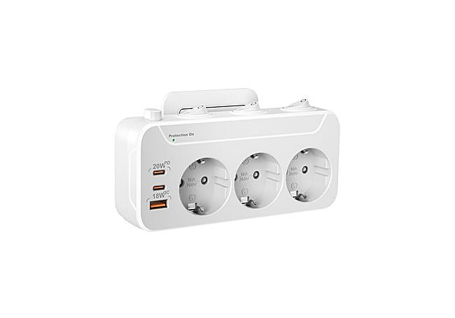 Con diseño giratorio de 90 grados, esta regleta múltiple AONOKA integra tres enchufes, tres puertos USB y protección contra sobretensiones de 1800J. Cada toma y puerto USB cuenta con interruptor independiente, lo que permite controlar el suministro de energía y ahorrar electricidad. Incorpora carga rápida PD20W y QC18W para dispositivos electrónicos, aportando eficiencia y seguridad en un formato compacto.