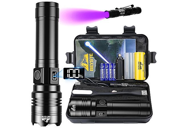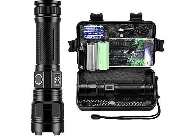 Con un chip XHQ99 avanzado, la linterna LED BEYSTE alcanza hasta 1.000.000 lúmenes y permite iluminar grandes superficies o enfocar a larga distancia. Su pantalla lateral LCD facilita el control de batería, mientras que el cuerpo de aluminio aeronáutico y la resistencia IPX6 aseguran durabilidad. Incluye linterna UV y luz USB para funciones adicionales.