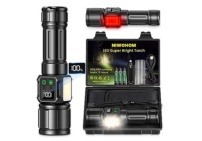 Con una potencia de 500.000 lúmenes, esta linterna LED recargable de NIWOHOM integra nueve modos de iluminación y pantalla LCD para visualizar la batería. Su diseño resistente en aluminio soporta caídas y es impermeable IPX67. El enfoque ajustable y la base magnética añaden versatilidad, mientras que la batería de larga duración permite un uso prolongado y eficiente en cualquier entorno.