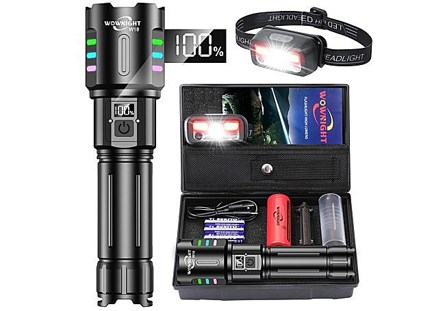 Con estructura de aluminio aeronáutico, la linterna WOWNIGHT W18 ofrece 500.000 lúmenes y un haz ajustable que alcanza hasta 1.500 metros. Incorpora pantalla LCD para el control de batería, modo de atenuación gradual y tiras fluorescentes para visibilidad en la oscuridad. Incluye faro frontal recargable y carga USB-C para una experiencia completa y resistente.