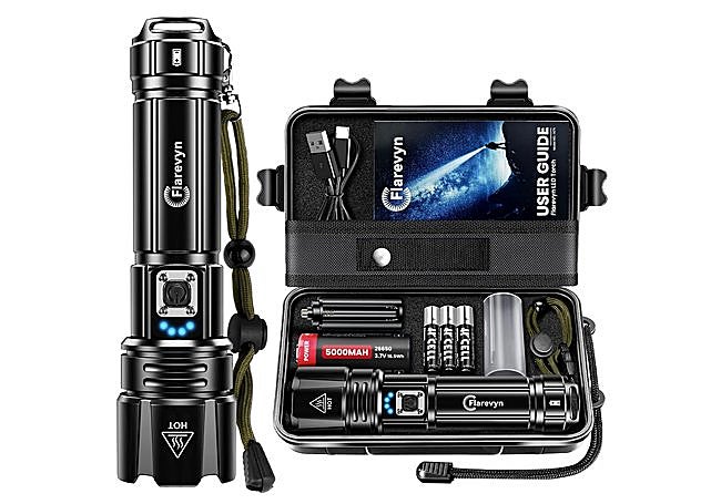 Con estructura robusta y tecnología LED avanzada, la linterna Flarevyn alcanza un millón de lúmenes y ofrece cinco modos de iluminación, incluyendo estroboscópico y SOS. Su batería de 5000 mAh proporciona hasta 24 horas de uso. El diseño resistente al agua IP67 y el enfoque ajustable garantizan funcionalidad en cualquier entorno, mientras que la carga USB-C añade practicidad.