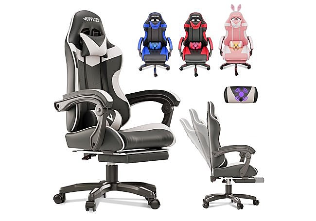 La silla gaming profesional de JUPPLIES es ideal. Esta silla ergonómica para gamers destaca por su diseño y materiales de alta calidad. Incluye masajeador lumbar, respaldo reclinable, reposapiés integrado y estructura ligera y estable. Además, es una silla de juego ajustable gracias al sistema de altura y reposabrazos regulables, adaptándose a cualquier escritorio.