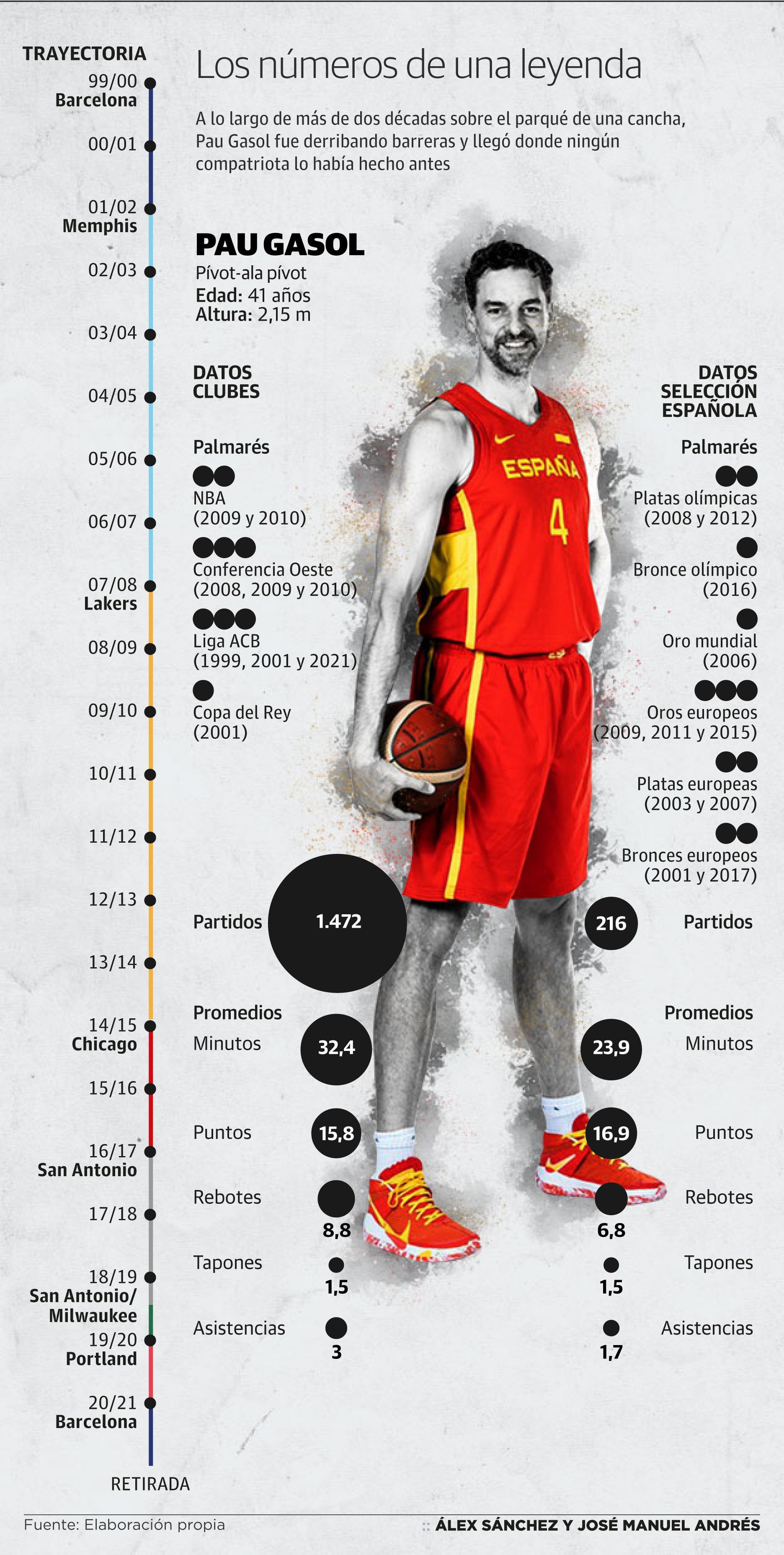 La trayectoria de Pau Gasol sobre el parqué parecía haber tocado a su fin pero hasta el final ha sido fiel a su leitmotiv de ir más allá. Trabajó en solitario durante meses para recuperarse a tiempo de disputar los Juegos Olímpicos de Tokio y quizás el aplazamiento de 2020 a 2021 lo hizo posible. También el Barça, con el que se despidió con su tercera Liga ACB aunque sin esa ansiada Euroliga que se escapó en la final de Colonia ante el Efes turco. Su carrera merecía un epílogo en activo, haciendo de nuevo posible lo que parecía imposible. Rompiendo barreras, como cuando viajó de Barcelona a Memphis siendo apenas un niño frente a la galaxia del baloncesto mundial.