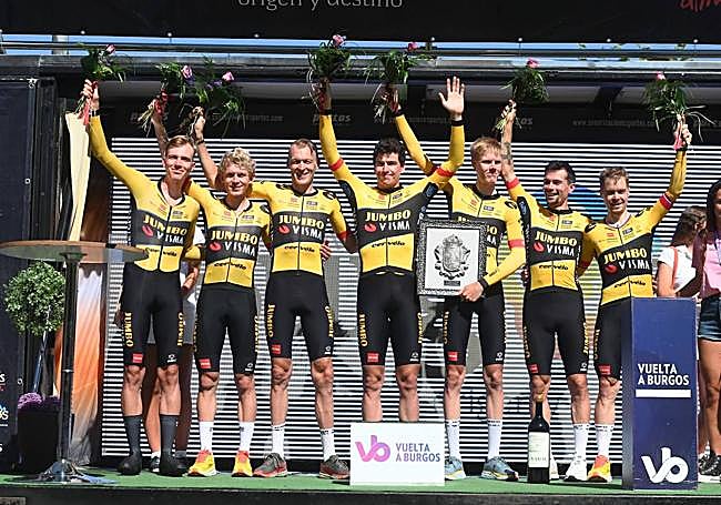 El Jumbo Visma ha utilizado 14 minutos 38 segundos en cubrir los 13, 6 kilómetros entre Oña y Poza de la Sal. A 19 segundos, el Movistar; a 30 El Bora; Bahrain ha perdido 31 segundos y el UAE Emirates se ha dejado 34 segundos. Education, Kern Pharma, Astana, Q36.5 y Burgos BH han completado los diez primeros clasificados.