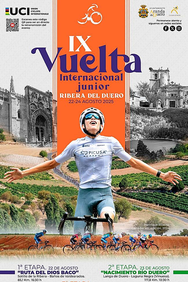 Será un cartel del diseñador gráfico Alberto Pérez el que una vez más sirva de carta de presentación a la ronda ciclista ribereña. Un trabajo en el que se rinde homenaje a Henrique Ribeiro, corredor brasileño del Picusa Academy, Henrique Ribeiro, que en 2024 se hizo con el maillot color vino de la Ribera del Duero que le acreditaba como ganador de la Vuelta. Es su imagen tras cruzar la línea de meta en la Laguna Negra en la segunda etapa de la octava edición, lo que le alzó hasta la cabeza de la clasificación general, la que protagoniza un póster en el que, además, re incluyen imágenes de las principales localidades que atravesará el pelotón, incluidas las tres en las que finalizarán las etapas diarias.