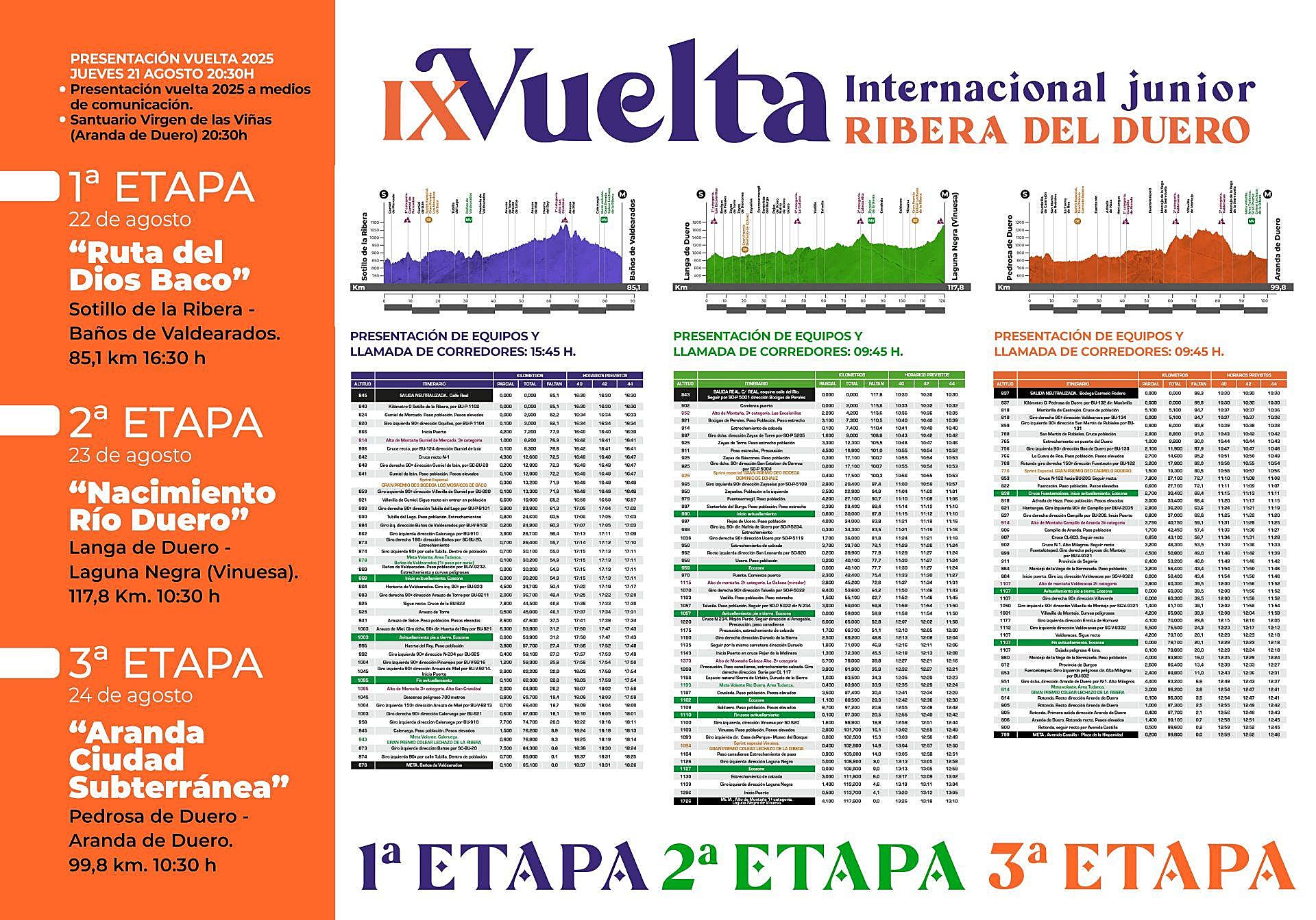 Ruta del dios Baco es el nombre que se le ha dado a la primera etapa, que discurrirá entre las localidades burgalesas de Sotillo de la Ribera y Baños de Valdearados y que se disputará el viernes 22 de agosto. Un total de 85,1 kilómetros, que se recorrerán a partir de las 16:30 horas de la tarde. Dos puertos de tercera categoría, uno solo ocho kilómetros después de arrancar, en Gumiel de Mercado, y el segundo, el Alto de San Cristóbal, en Araúzo de Miel, un sprint especial en el kilómetro 13,300 y dos metas volantes, en Baños de Valdearados, en el kilómetro 30,200 y en Caleruega (km. 76,800) son los puntos de interés de esta primera jornada.