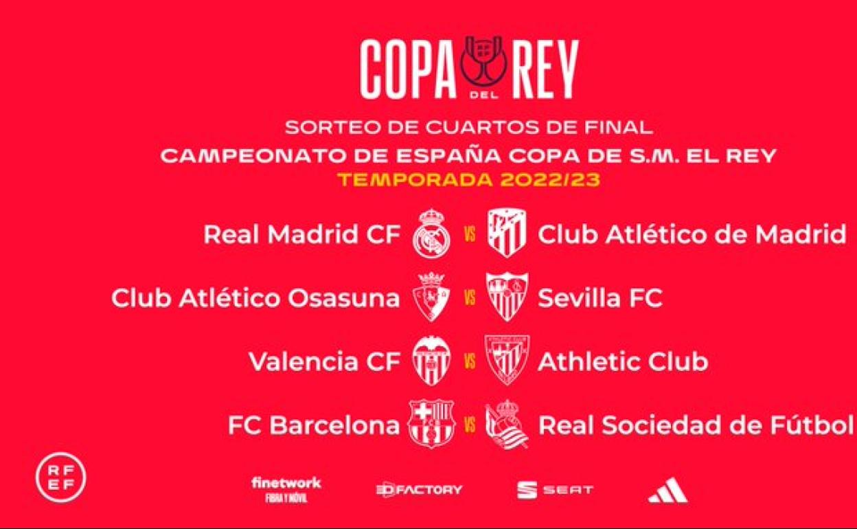 El Real Madrid-Atlético fue el bombazo del sorteo de cuartos celebrado este viernes en la Ciudad del Fútbol de Las Rozas, pero el destino deparó otros tres enfrentamientos de alto voltaje: Barcelona-Real Sociedad, Valencia-Athletic y Osasuna-Sevilla. El equipo navarro, que cinco años después volverá a jugar una eliminatoria en su campo, es el único que no ha conquistado nunca la Copa, pero se presenta en cuartos tras haber despedido al vigente campeón, el Betis, por penaltis en el Benito Villamarín.