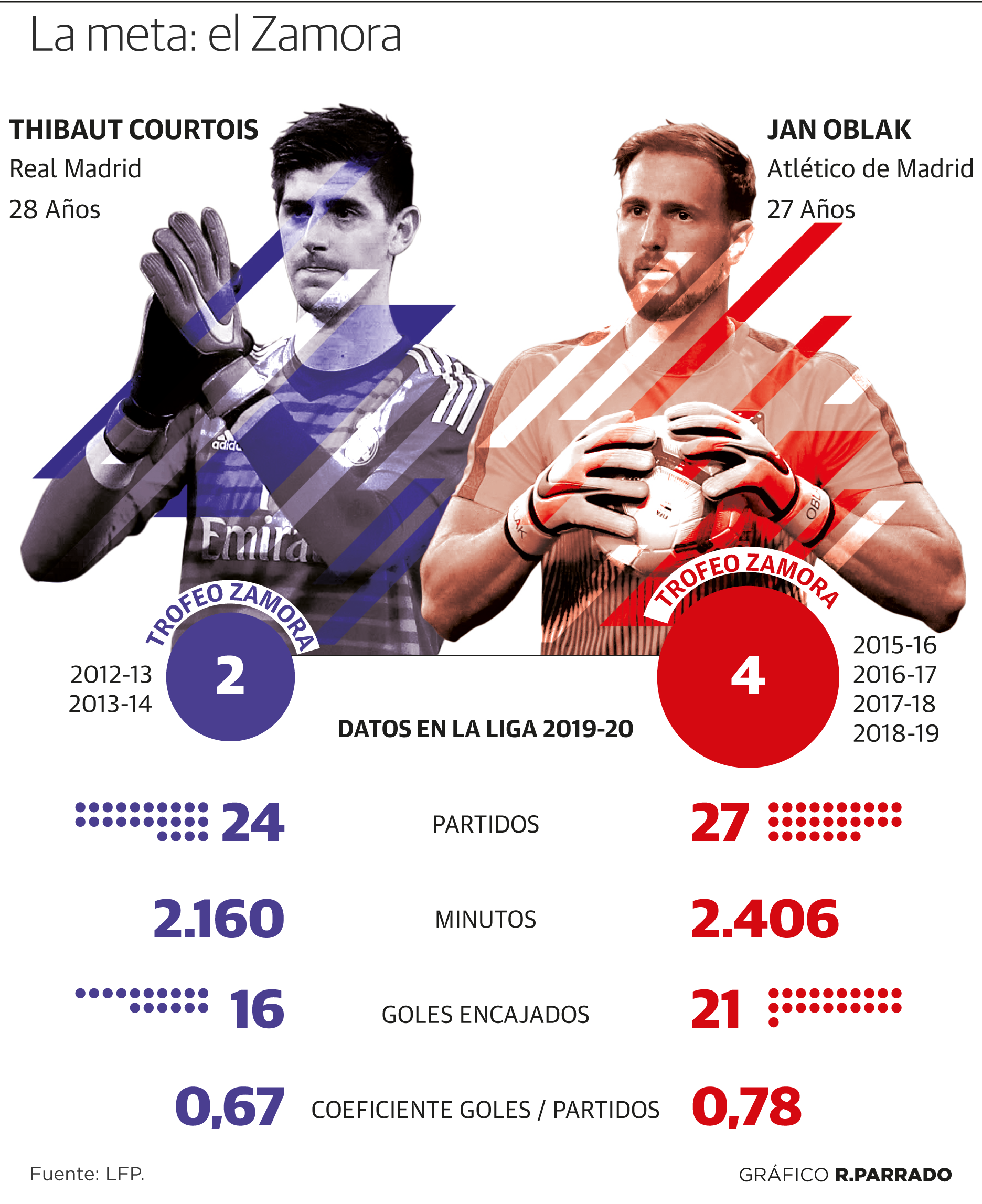 La versión más rocosa de este Real Madrid de la segunda etapa de Zidane y la adaptación de Courtois al club blanco tras una temporada inicial complicada con la alargada sombra de Keylor han permitido al belga no sólo poner en aprietos a Oblak, sino arrebatarle por ahora el liderato del Trofeo Zamora. El exportero colchonero sabe bien lo que es pelear por el galardón, de hecho lo conquistó dos veces (2012-13 y 2013-14) durante su etapa en el Atlético. Al parón obligado por la pandemia de la Covid-19 llegó líder, con sólo 16 goles encajados en 24 partidos, para un coeficiente de 0,67. Los tres partidos en los que dejó su lugar en el once al francés Alphonse Areola no le impiden pelear por el galardón, pues basta con alcanzar los 28 encuentros disputados en al menos 60 de los 90 minutos.