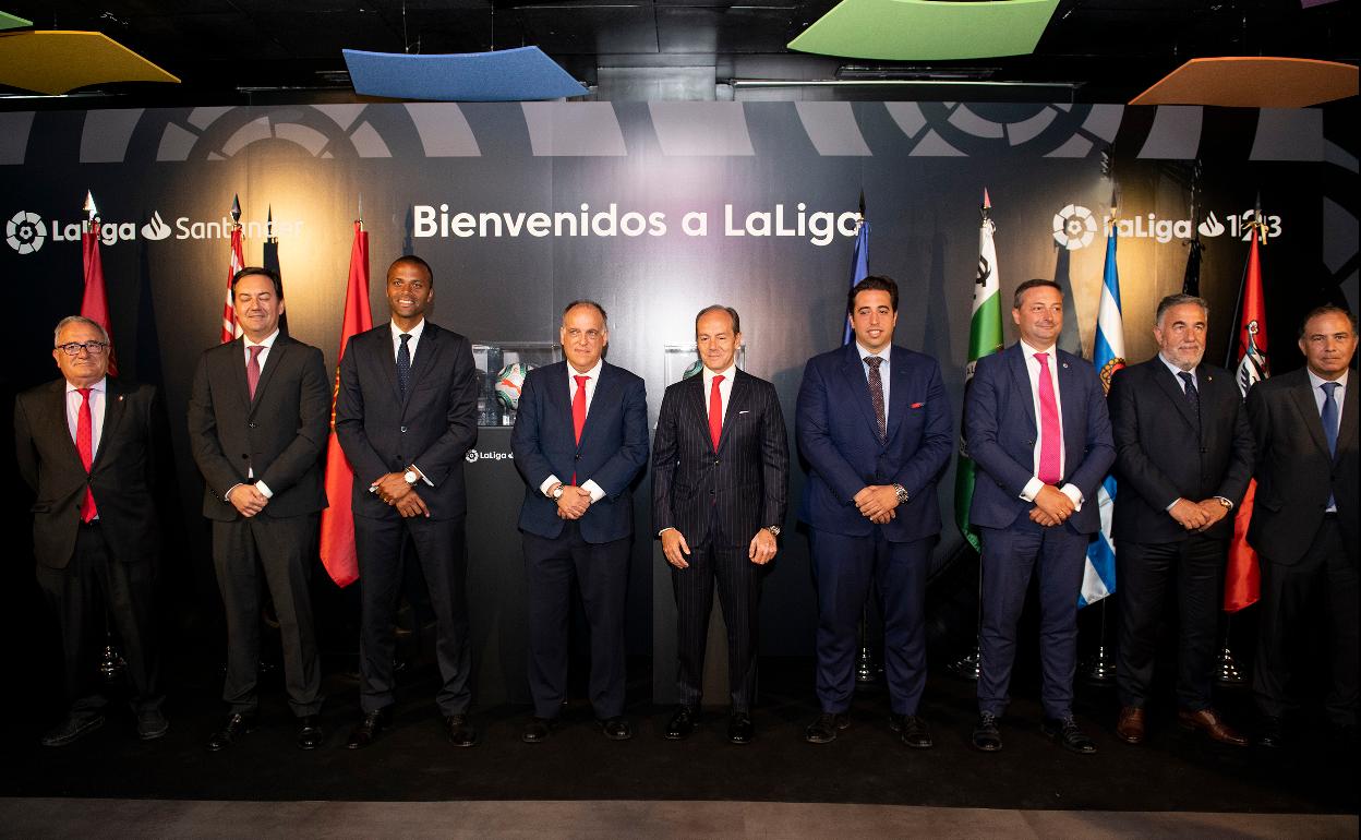El presidente de LaLiga, Javier Tebas, dio la bienvenida en un acto celebrado en la sede de la patronal de los clubes a los tres ascendidos esta temporada a Primera -Osasuna, Granada y Real Mallorca-, así como a los cuatro equipos que llegan al fútbol profesional con su ascenso desde Segunda B a Segunda -Fuenlabrada, Racing de Santander, Ponferradina y Mirandés-.