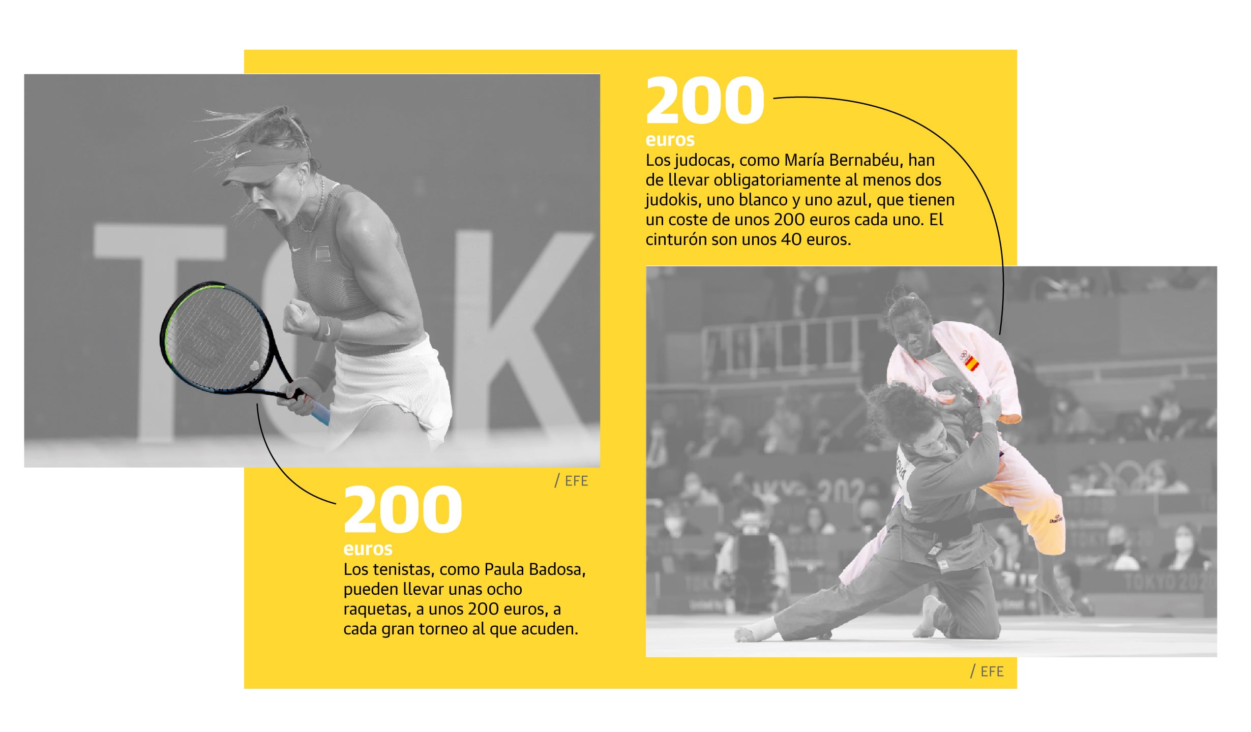 También los tenistas llevan varias raquetas, unas ocho a 200 euros cada una. En un recuento aproximado de la Real Federación Española de Tenis sobre lo que usan estos deportistas en un gran torneo salen además un par de rollos de cordaje (200 euros por unidad), 3 o 4 encordados por partido (25 euros por unidad), cinco overgrip (15 euros) y cinco antivibradores (25 euros), 50 polos (50-90 euros cada uno), 20 pantalones (40 euros) y 20 pares de calcetines (10 euros), tres zapatillas (120 euros)... Solo incluyen un raquetero (100 euros). Y no llevan cuerda los deportistas de tenis de mesa, pero durante los días de competición sí que cambian a menudo las gomas (la parte de color). Estas se pueden encontrar por unos 70 euros mientras que la madera puede sobrepasar los 300.
