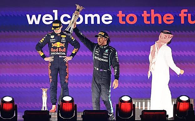 Max Verstappen y Lewis Hamilton, durante el Gran Premio de Arabia Saudí. Giuseppe Cacace (Afp)