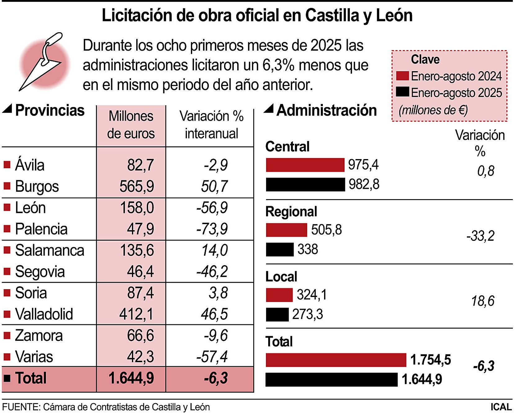 Por tanto, las administraciones tienen en Castilla y León cuatro meses para darle la vuelta a las cifras de licitación registradas en los ocho primeros meses y alcanzar la inversión del pasado año, cuando se licitaron 2.367 millones y se adjudicaron contratos por valor de 1.969 adjudicados. Entonces ya se produjo una contracción de la inversión del 2,2 por ciento respecto a 2023, por lo que 2025 podría ser el tercer año que cierre en negativo.