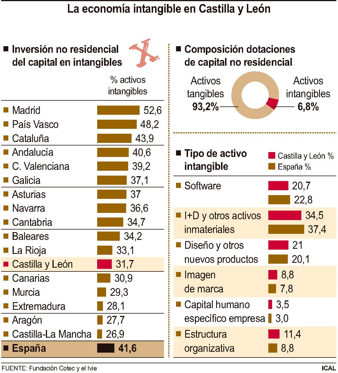 La inversión no residencial del capital en Castilla y León cada vez apuesta más por 'intangibles' (software, I+D y otros activos inmateriales, diseño y otros nuevos productos, imagen de marca, capital humano específico de la empresa y estructura organizativa) para generar renta y actividad. Un informe de la Fundación Cotec y el Ivie revela que la inversión en intangibles representó en 2023 en la Comunidad el 31,7 por ciento del total, frente al 68,3 por ciento para tangibles.
