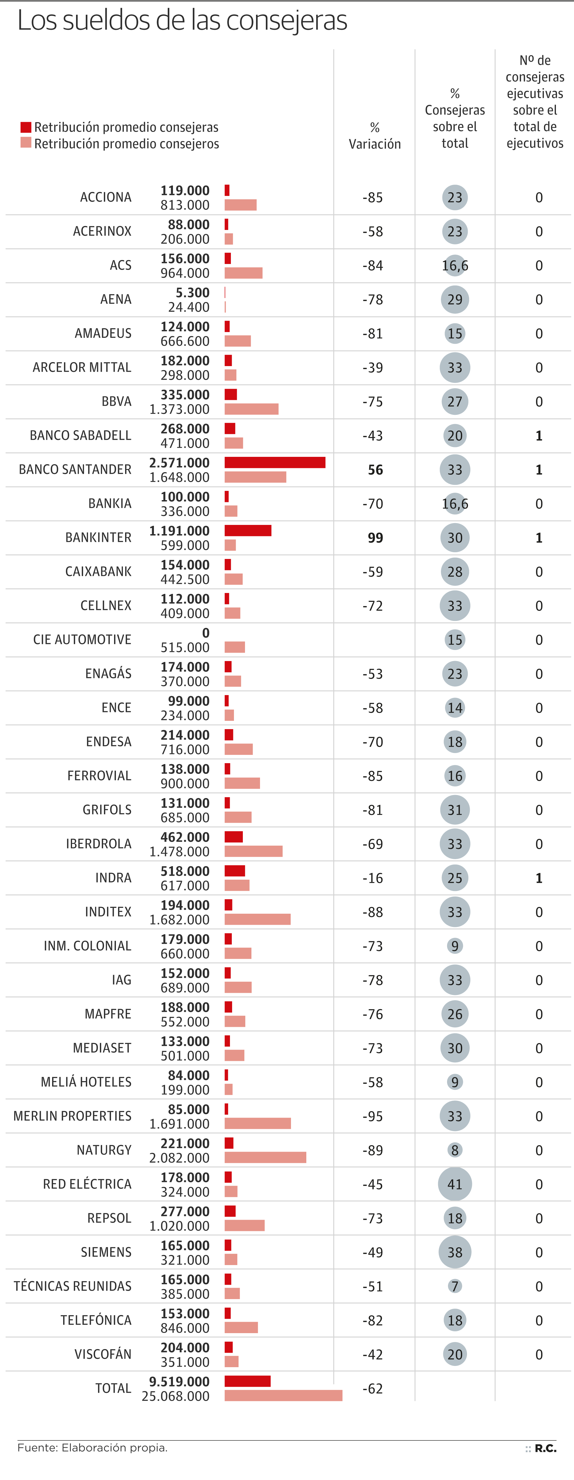 Aunque no en todas las empresas es así. Por ejemplo, en el Banco Santander, las consejeras ganan un 56% más que los hombres (en promedio), y en Bankinter, un 99% más debido al peso que tienen los sueldos de las máximas ejecutivas de ambas entidades financieras, Ana Botín, presidenta del Santander, y María Dolores Dancausa,consejera delegada de Bankinter. Pero estas son las dos únicas empresas donde ganan más las mujeres. La gran diferencia salarial entre géneros en el Ibex no se debe a que las empresas paguen diferente en función del sexo, sino que obedece a que muy pocas mujeres ocupan los puestos más elevados.