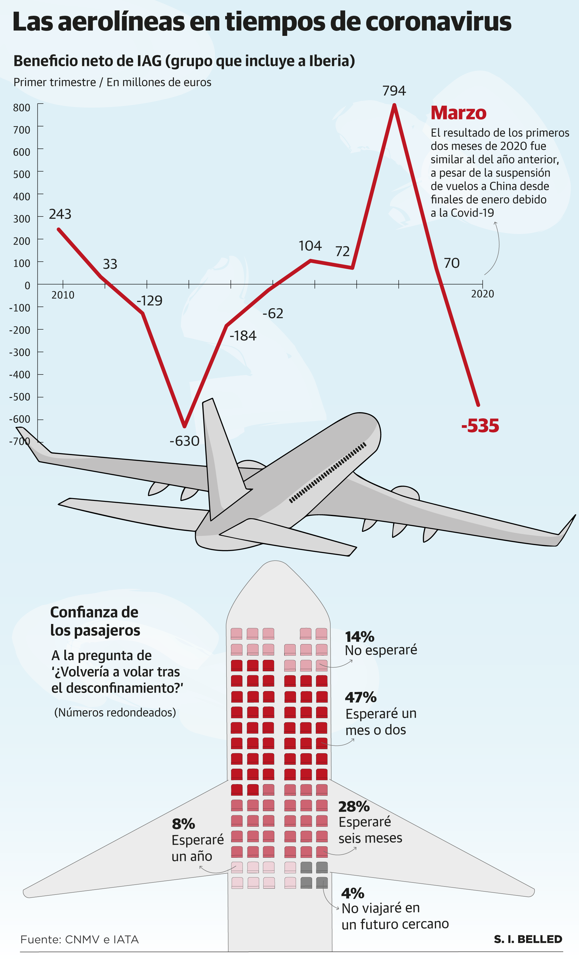 De ahí que a nadie le sorprenda que Iberia haya pedido también ayuda al Estado. El pasado viernes la compañía del grupo IAG solicitaba junto a Vueling más de 1.000 millones para amortiguar el impacto del coronavirus en sus cuentas. Según comunicaron las aerolíneas a la CNMV, pedirán 750 y 260 millones de euros, respectivamente, con aval del ICO (Instituto de Crédito Oficial) después de que el desplome del tráfico aéreo haya hecho perder a la matriz IAG 535 millones de euros en el primer trimestre.