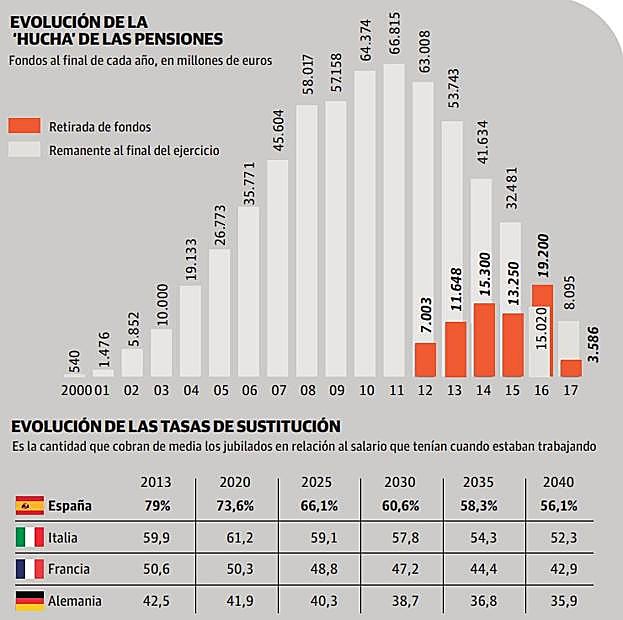 Y todo esto sucede mientras los partidos políticos, volcados en el debate sobre el ‘procés’ catalán, muestran su absoluta incapacidad para diseñar en el seno del Pacto de Toledo un nuevo marco que garantice la viabilidad del sistema, muy débil como evidencia el brutal déficit de la Seguridad Social: 18.000 millones de euros el año pasado, un agujero que este ejercicio acabará en niveles muy parecidos. Eso, sin contar con que a la denominada ‘hucha de las pensiones’ solo le queda para otra paga.
