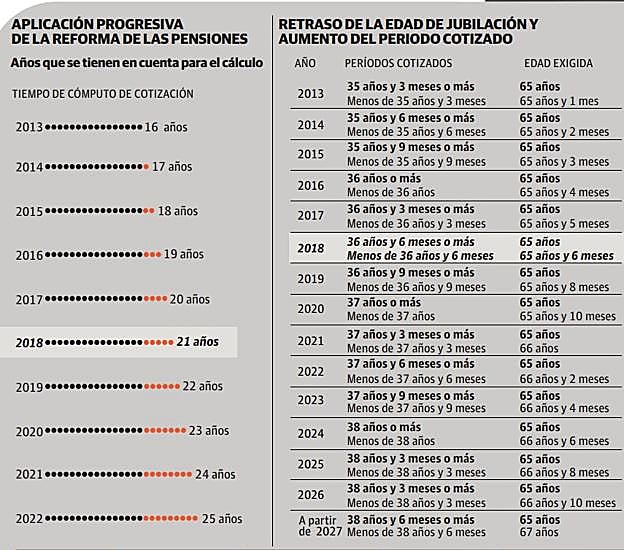 Año nuevo y condiciones aún más duras para la jubilación. La reforma del sistema de pensiones, cuyas bases puso Zapatero y completó su sucesor Rajoy hace un lustro, avanza inexorable conforme a los calendarios marcados y, con la llegada de 2018, incorpora novedades que suponen otra vuelta de tuerca. Son sustancialmente dos que, en muy pocas palabras, suponen trabajar más y cobrar menos. A partir del 1 de enero, la edad ordinaria de retiro aumentará hasta 65 años y seis meses –un mes más que hasta ahora–, pero podrán seguir jubilándose a los 65 quienes hayan cotizado al menos durante 36 años y seis meses, tres meses más que en la actualidad. En ambos casos se computarán para hacer el cálculo de la pensión los últimos 21 años cotizados; esto es, uno más que en 2017.