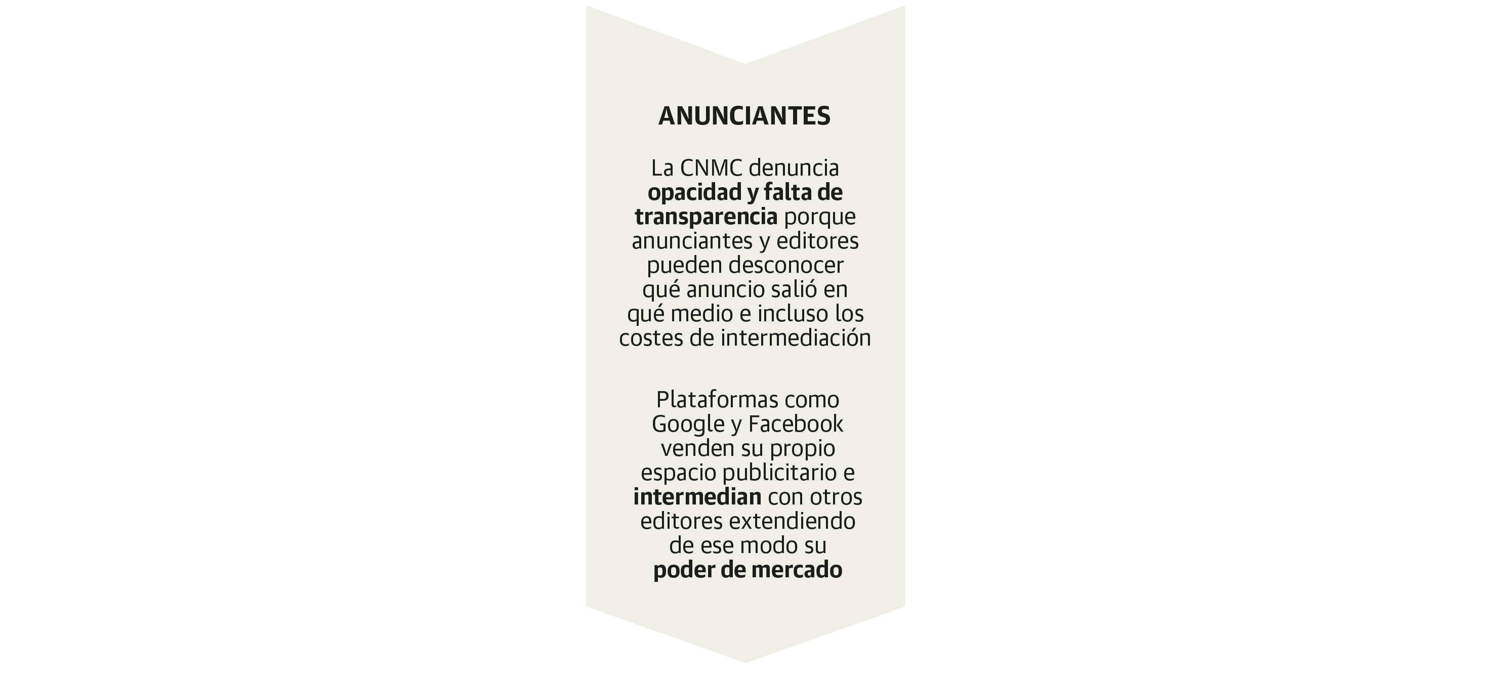 La crudeza de estos datos no deja lugar a dudas ni siquiera para la CNMC, que habla de problemas para la competencia entre las empresas, y de falta de transparencia, para los ciudadanos. No son cuestiones baladíes ni para las corporaciones ni para los millones de usuarios que utilizan diariamente estas plataformas. En el caso de la concentración, porque no tiende a disminuir, «sino todo lo contrario», según Joaquín López, director de Promoción de la Competencia de la CNMC. La ausencia de un proceso transparente refuerza el poder de estas plataformas e intermediarios que cuentan con más información que los compradores de publicidad.