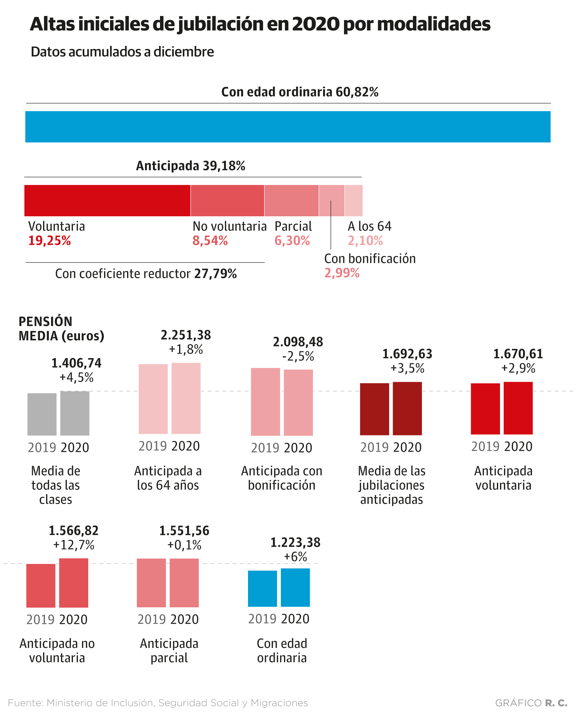 Pero no todas las jubilaciones anticipadas son fruto de una decisión propia. Así, 24.500 personas se vieron obligadas a un retiro forzoso el año pasado debido a que fueron expulsadas del mercado de trabajo de forma prematura, muchos a causa de un despido colectivo, y se encontraban en situación de desempleo. Casi uno de cada diez nuevos jubilados, una cantidad que incluso en 2019 se elevó hasta los 33.500. También del desempleo proceden otra parte importante de las prejubilaciones voluntarias: casi 9.000 en 2019 (último dato disponible), por lo que se eleva hasta el 35% el porcentaje de personas que se jubilan anticipadamente debido a que están en paro.