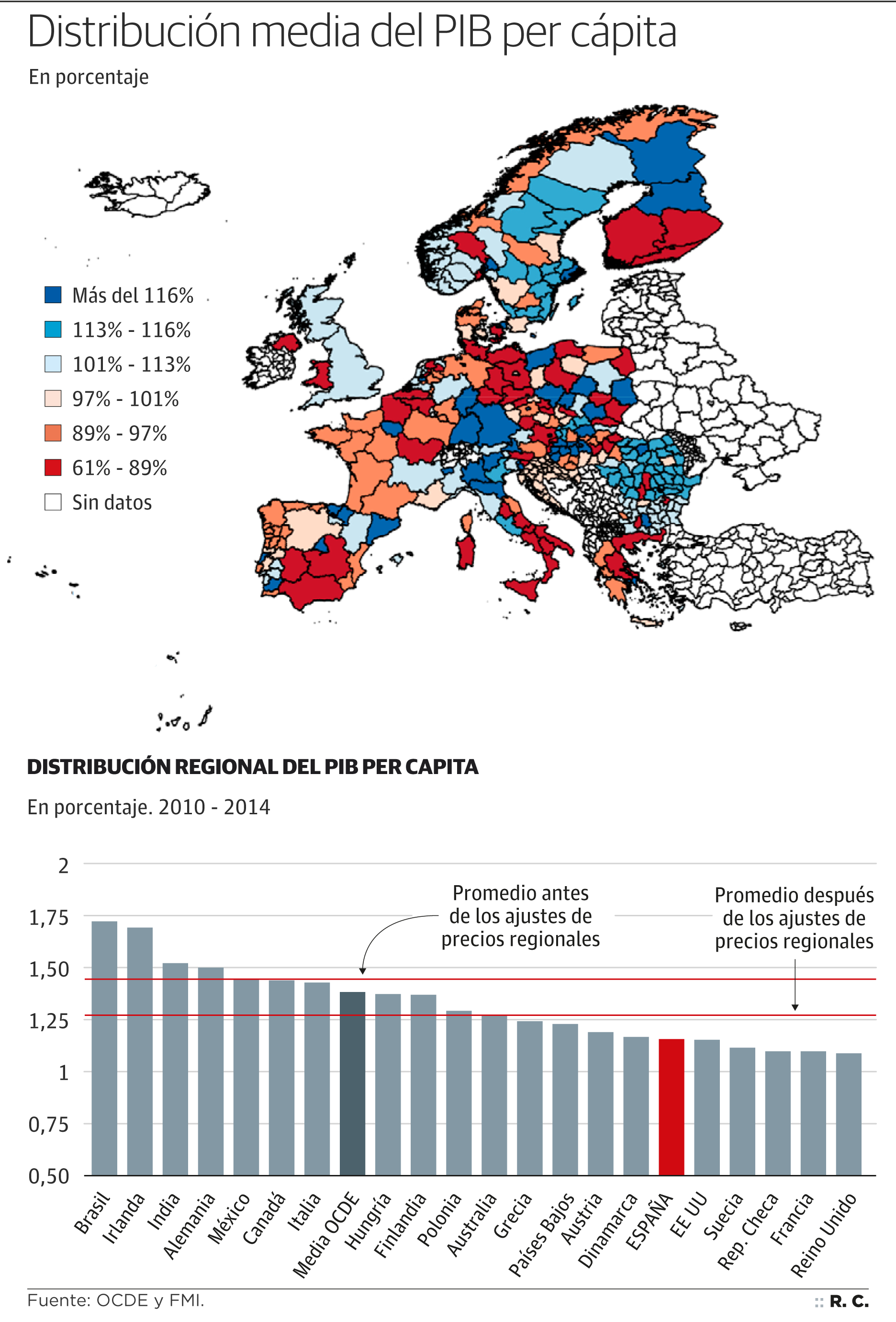 De esta forma, el FMI hace hincapié en la positiva idea de algunos países -como España- de redistribuir la riqueza entre todas las regiones, aunque estas aporten menos al PIB nacional, para reducir las diferencias. Alerta, sin embargo, de las grandes disparidades en renta que tienen grandes potencias mundiales como Brasil, Alemania, Canadá o Irlanda.