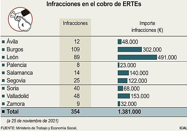 Por provincias, es en Burgos donde se han producido la mayor parte de las infracciones, con 109, una tercera parte del total, que se traduce en sanciones por valor de 302.000 euros; pero es León, con 89 ERTE en fraude, la que suma la mayor cifra económica, con 491.000 euros, es decir, un 3% de las sanciones monetarias, algo que los sindicatos achacaron al importante peso del sector servicios y la construcción, que han aglutinado la mayor parte de los expedientes y, por tanto, obviamente, de las infracciones.