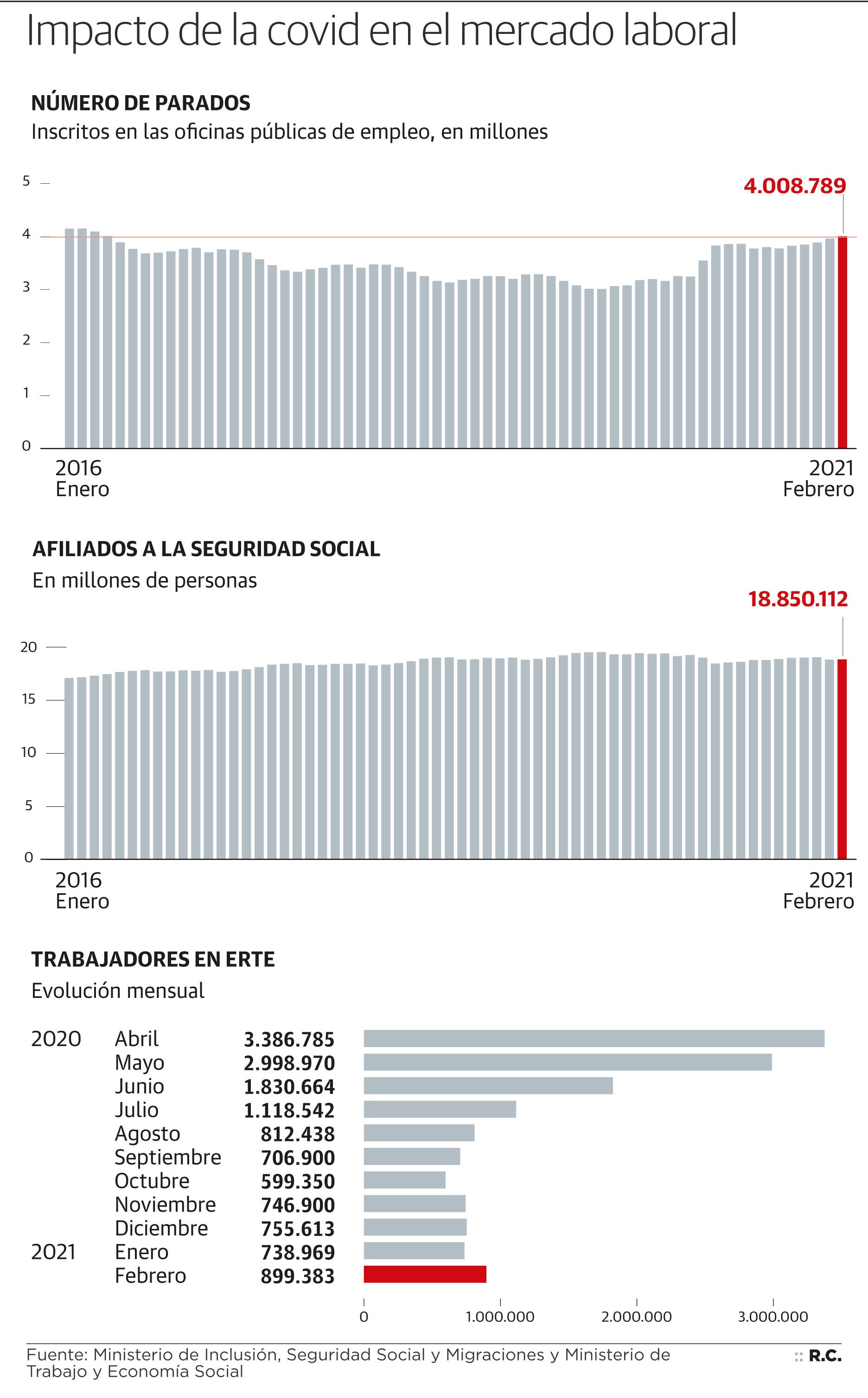 La tercera ola de la covid-19 esta vez sí se ha reflejado con virulencia en el mercado laboral. España vuelve a superar la barrera de los cuatro millones de parados cinco años después. Las fuertes restricciones impuestas para frenar el avance del virus ha provocado la mayor subida del desempleo en un mes de febrero desde el año 2013, en plena Gran Recesión: 44.436 nuevas personas se inscribieron en las oficinas públicas de empleo y elevaron el paro hasta los 4.0008.789, según los datos publicados este martes por el Ministerio de Trabajo. Se trata de una cifra que no se alcanzaba desde abril de 2016, el quinto aumento consecutivo del paro y supone además 762.742 personas más que un año atrás.