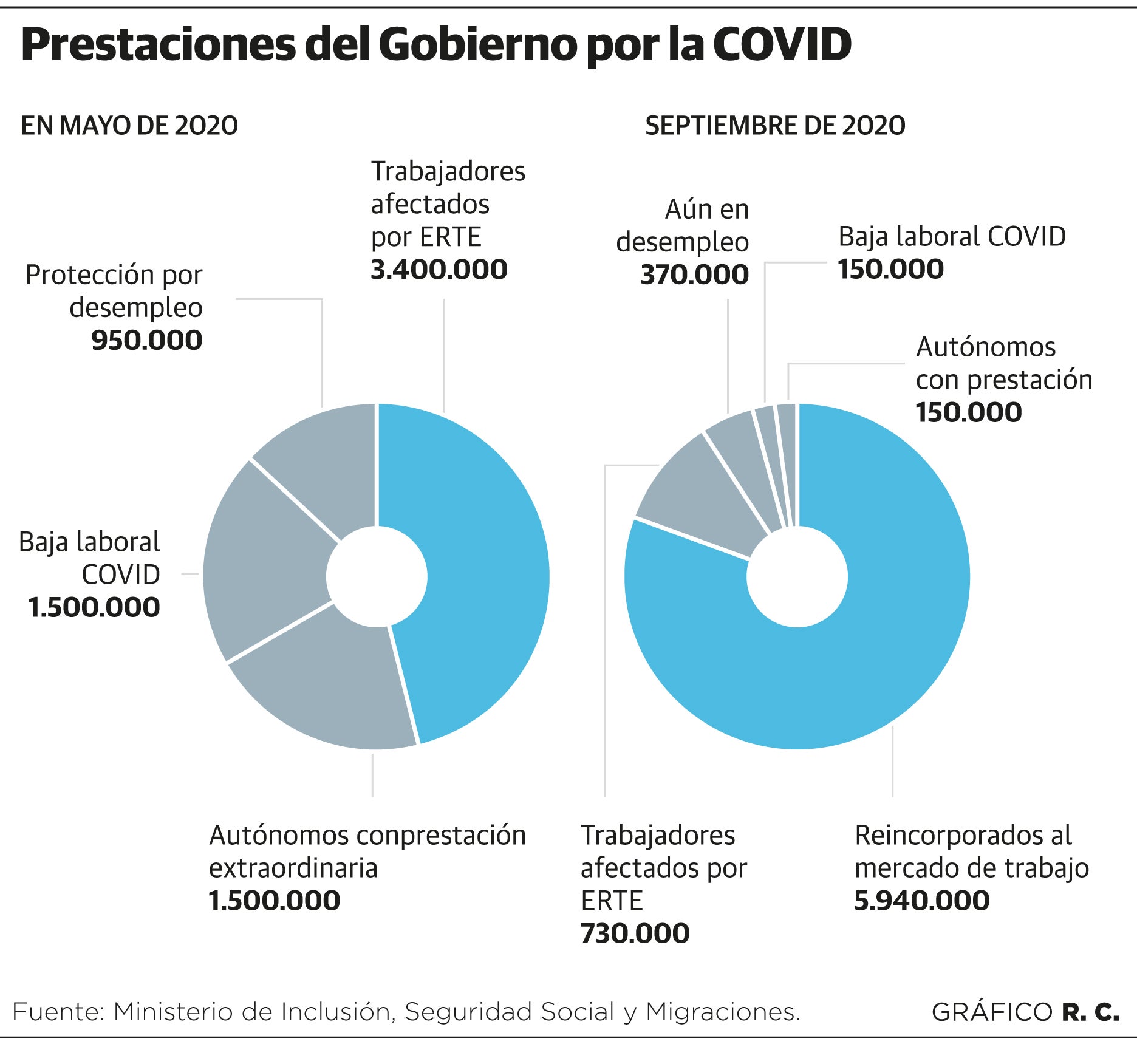 Aún así, se trata de una cifra muy inferior a la de mayo, el momento álgido de esta crisis, cuando el Gobierno, a consecuencia del virus, asumió el pago de las rentas de más de 7,3 millones de personas, más de un tercio de la población activa, que se sumaban a las que ya tenía. El Estado llegó a abonar en un mes 3,4 millones de prestaciones por desempleo a afectados por un ERTE, el paro a las 950.00 personas que se quedaron sin empleo, las ayudas a 1,5 millones de autónomos (lo que supone casi la mitad del colectivo) y 1,5 millones de bajas laborales por covid.
