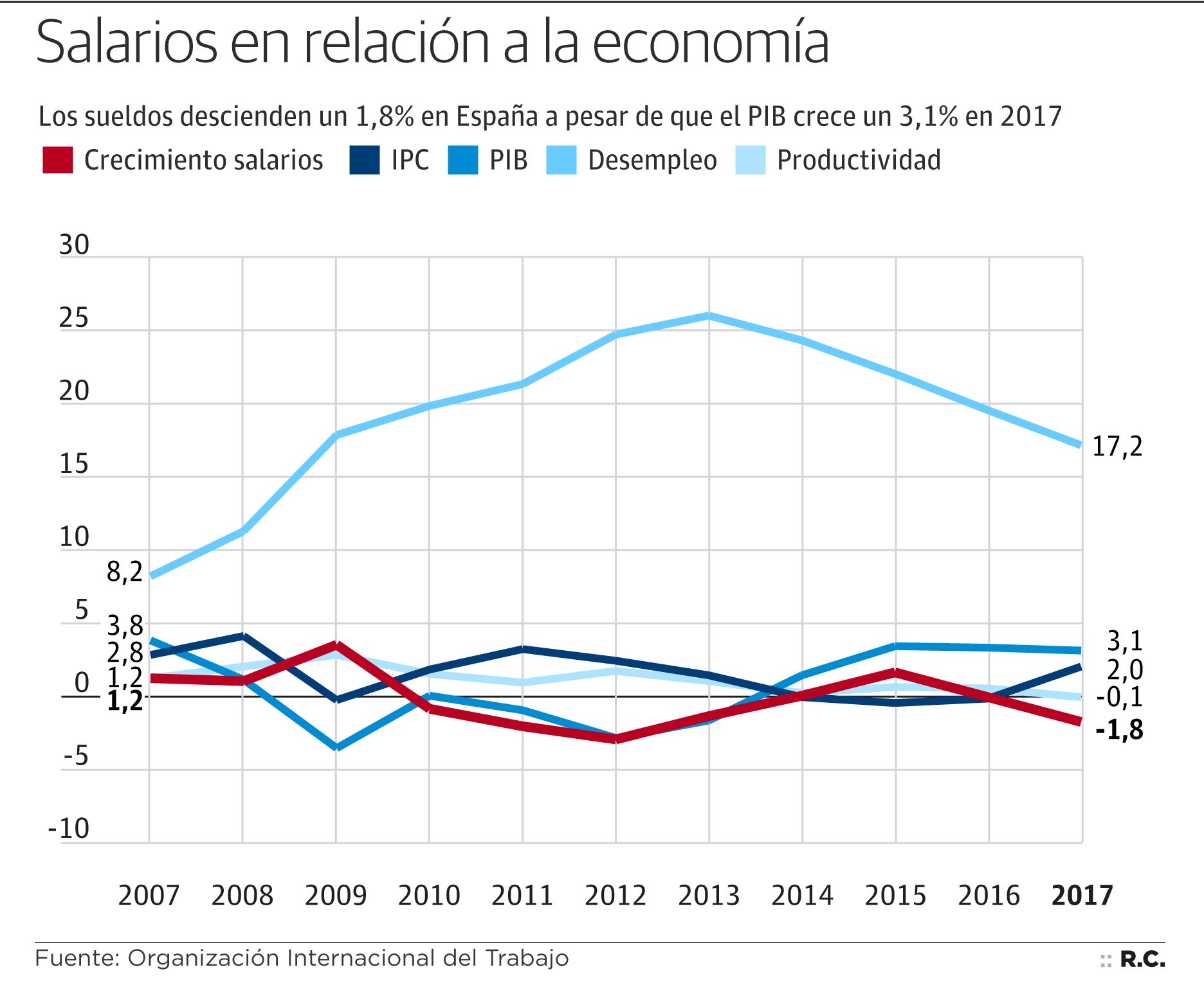 Desde 2008 no había un nivel tan bajo de salarios a nivel mundial ya que su crecimiento ha sido mucho más lento de lo esperado. En España, los sueldos reales -corregida la inflación- disminuyeron un 1,8% el año pasado, su nivel más bajo desde antes de la crisis, según el informe publicado este martes por la Organización Internacional del Trabajo (OIT), y todo ello a pesar de que en 2017 la economía española avanzó un 3,1%.