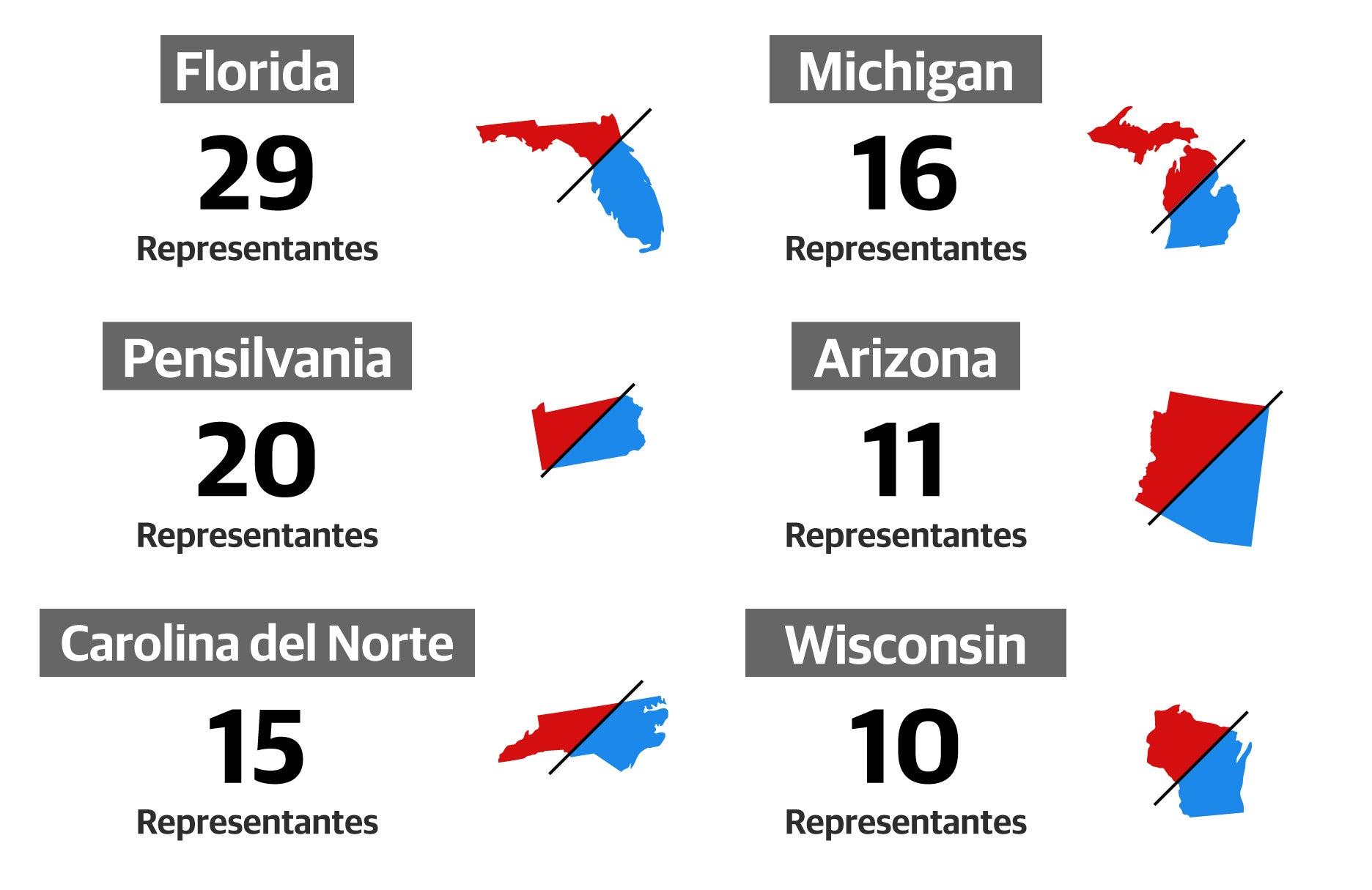 Por este orden, Florida, Pensilvania, Carolina del Norte, Michigan, Arizona y Wisconsin.