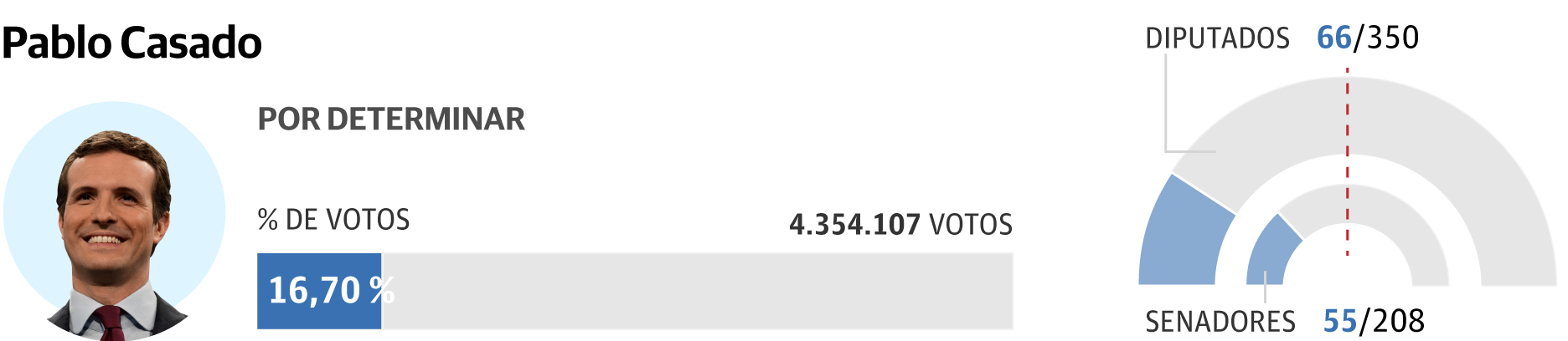 Pablo Casado ha perdido 71 escaños con respecto a los que logró Mariano Rajoy en 2016 y 121 en comparación con la histórica mayoría absoluta de 2011. También está lejos de los 154 representantes populares que entraron en la Cámara baja en 2008 y de los 148 que formaron la oposición a partir de 2004. Incluso muy lejos de su propio suelo, el de los 107 diputados de su estreno en 1989.