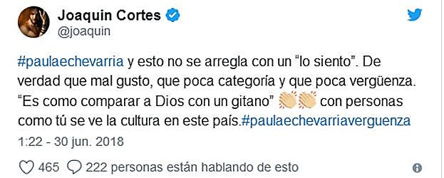 Estas palabras parece que no fueron del agrado de Joaquín Cortés, tal y como lo ha dejado de manifiesto en su perfil de Twitter: «Pocas veces me he sentido más avergonzado de una persona como de ti», y añadía: «Ahí se ve el nivel cultural de las personas, la educación, la falta de respeto y, sobre todo, la falta de humanidad. Llevábamos año luchando por promover la igualdad y llegas tú y menosprecias una etnia que ni conoces».